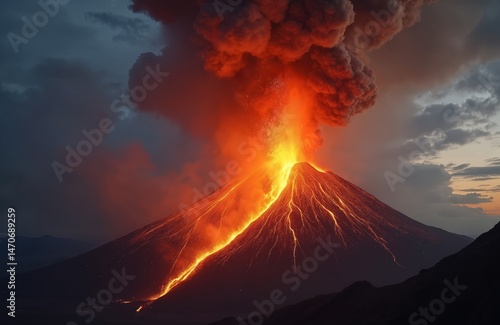 Volcano Fuego erupting with lava magma ashes. Guatemala, active vulcan landscape. Fiery orange explosion, dark smoke. Epic fire, nature. Danger, heat, ash, clouds, sunset.
