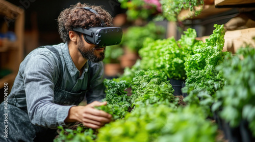 VR simulation training for organic farming techniques: Farmer using VR headset to learn organic farming techniques with simulated crops and tools in virtual environment
