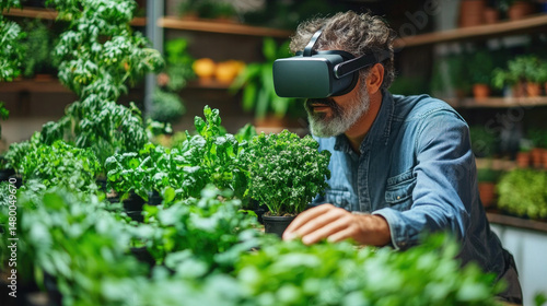 VR simulation training for organic farming techniques: Farmer using VR headset to learn organic farming techniques with simulated crops and tools in virtual environment