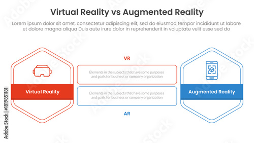 vr vs ar technology comparison concept for infographic template banner with hexagon outline shape and rectangle with two point list information