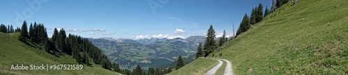 Vue panoramique des pâturages et des montagnes avoisinantes au lac de Seebergsee en Suisse