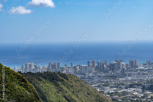 Waʻahila Ridge Trail, Honolulu, Oahu, Hawaii. Waikiki Beach is visible in the distance. Koʻolau Range, shield volcano. Mānoa Valley is on the right.