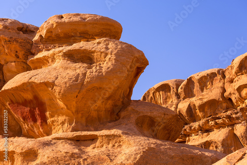 Wadi Rum, Jordan beautiful view of orange mountain sandstone rocks close-up