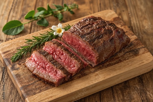 Wagyu Beef Pieces Presented on a Rustic Wooden Platter with Flowers and Cooking Elements