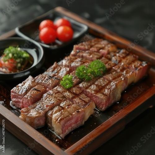 Wagyu ribeye steak, rich texture, mouth-watering, served on wooden tray, culinary delight,