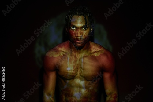 portrait, projector, atom, bomb, explosion, shirtless, studio, black, background, light, low key, stare, strong, anger, furious, torso, contrast, eye, gaze, mental, emotion, fierce, abstract, bare, dark, muscular, masculine, insane, disorder, personality, stress, danger, psychological, horror, male, angry, man, african american, diversity, ethnicity, trouble, concept, creative, copy space