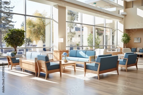 furniture, armchair, sofa, coffee table, lamp, wood, blue, white, modern, interior design, architecture, lobby, lounge, clinic, hospital, medical center, waiting room, chair, table, decoration, office furniture