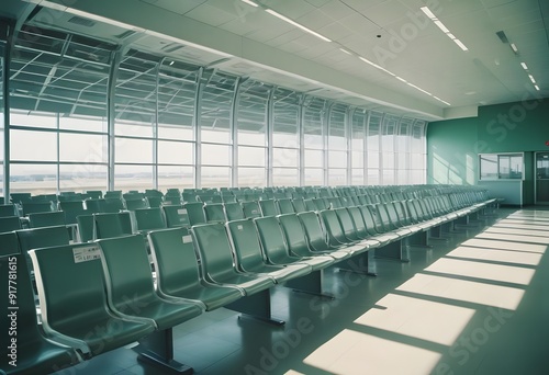 Waiting room in the airport. An empty airport terminal with rows of green leather seats, large windows, and fluorescent lighting