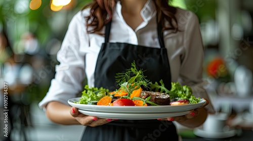 waitress, eatery, plate, salad, grilled meat, fresh vegetable, serving, food, culinary, dish, vibrant, dining, meal, herb, colourful, atmosphere, chef, hospitality, client, life events, garnish, nourishment, healthy, enjoy, epicure, professional, tasty, wholesome, lunch, dinner, presentation, delicious, cookery, freshness, menu