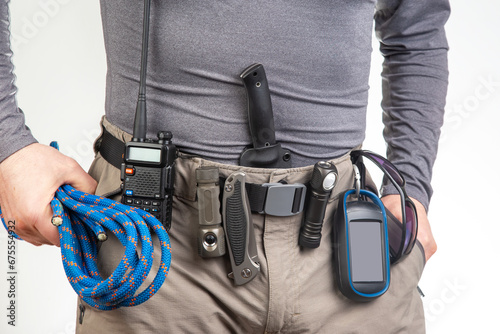 walkie-talkie, flashlight, knife, GPS navigator, climbing rope on the belt of the tourist trekking pants. equipment for tourism and travel. EDC items.