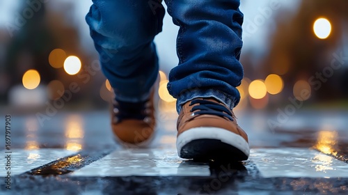 Walking in brown leather sneakers on wet pavement at dusk, with soft bokeh lights creating atmospheric urban mood. Reflection of city lights on rain-soaked ground.