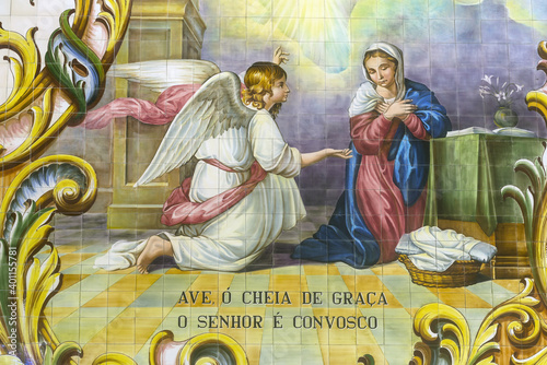 wall covered with azulejos of religious inspiration inside the church of Valega district of Aveiro, Portugal
