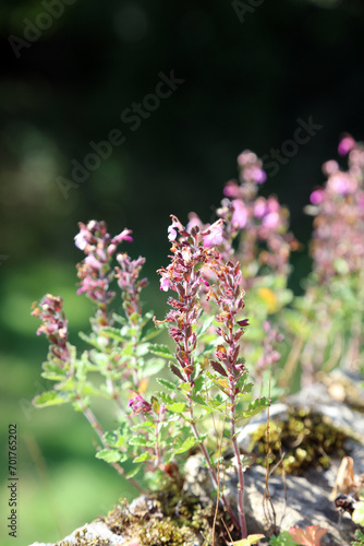 Wall Germander plant growing on a wall, Derbyshire England