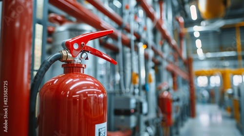 Wall-mounted fire extinguisher in a powerful energy factory, emphasizing its role as essential emergency equipment, bright industrial background