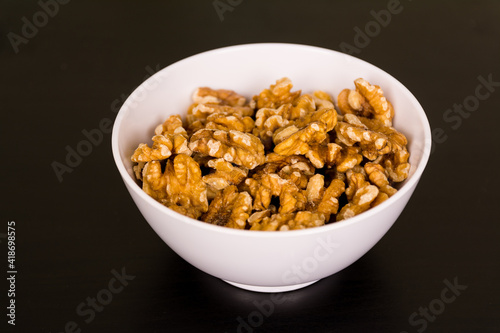Walnuts, a bunch of peeled walnuts in white bowl on black table