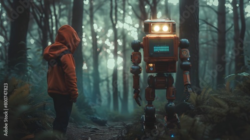 wanderer, forest, robot, technology, automation, nature, mysterious, adventure, discovery, futuristic, coexistence, cautious, scurry, interaction, environment, contemplation, wonder, enchantment, enigma, android, machinery, company, industry, insight