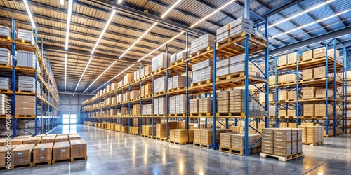 Warehouse Interior with Stacked Cardboard Boxes on Metal Shelving, wide shot, blue and yellow, industrial interior, warehouse, distribution, logistics