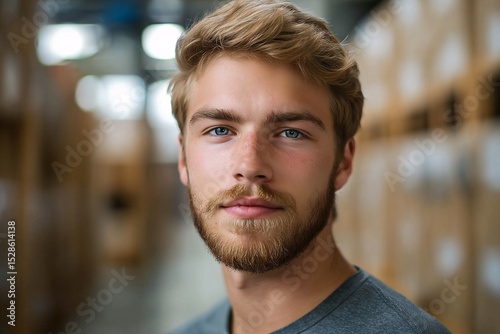man, portrait, warehouse, beard, blonde hair, blue eye, casual attire, young adult, indoor, smiling, natural light, working environment, professional, sharpened, confidence, male model, head shot, storage, modern, styling, good, surrounding, closeup, workplace, personality, introspection, motivational, masculinity