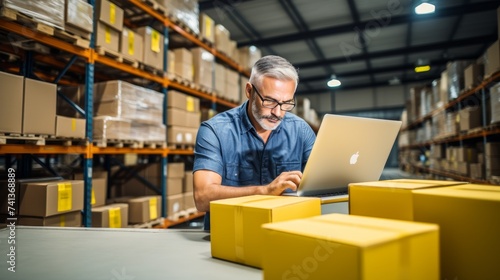 Warehouse worker checking delivery and managing stock on computer, phone call with contractor