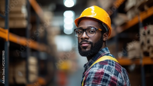 Warehouse worker in safety gear confidently looking at the camera in a busy storage area during the day