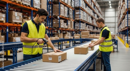 warehouse, men at work, package, scanning, conveyer, belt, logistic, distribution, organisation, staff, service, efficiency, teamwork, management, wide, efficient, facility, man, professional, shipping, quality, order, inventory, huge, commerce, operation, rack, scanner, barcode, good, supply, manufacturing, storage, package, retail, production, e-business, transportation, large, automation, processing, product, industry, chain, business, technology