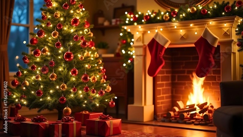 Warm and Classic Christmas Eve Atmosphere with Lit Christmas Tree, Roaring Fireplace, and Hanging Red Stockings