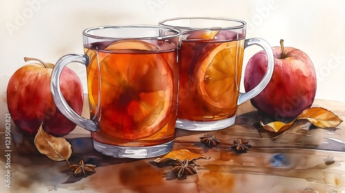 Warm and Cozy Watercolor Illustration of Hot Cider Perfect for Autumn and Winter Recipes, Blogs, and Seasonal Designs.