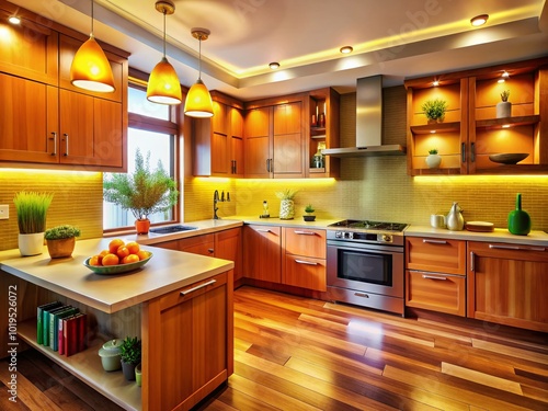 Warm and Inviting Kitchen Background with Modern Appliances, Wooden Cabinets, and Bright Lighting