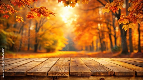 Warm autumnal scene with wooden table, surrounded by vibrant orange leaves, against a blurred background of trees and sky, evoking cozy fall atmosphere, warm lighting, autumn