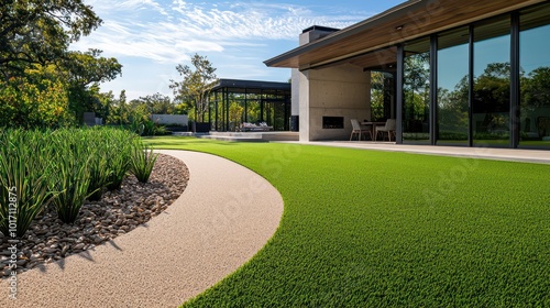 Warm beige synthetic grass paired with a modern home and a minimalist concrete path, perfect for a backyard oasis