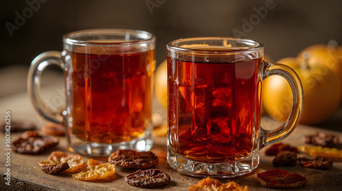 Warm beverage tea or cider with fruit and spices in glass cups on a rustic wooden table