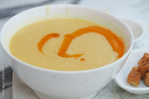 Warm bowl of creamy soup with drizzle and croutons