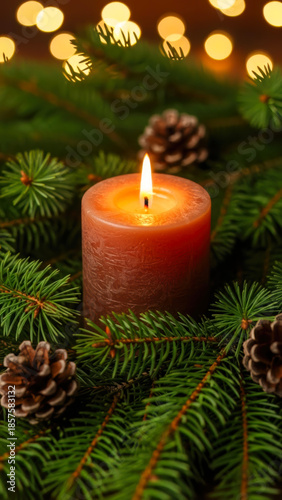 Warm Candlelit Pine Branches and Pine Cones with Soft Bokeh Lights Cozy Winter Serenity and Festive Glow Intimate Atmosphere
