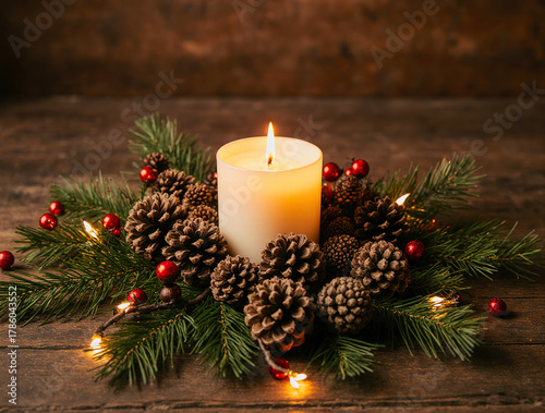 christmas, candle, pine cone, evergreen, rustic, festive, holiday, decoration, winter, warmth, cosy, light, berry, natural, wood, table, centrepiece, seasonal, celebration, glowing, illumination, traditional, pine, fir, winter holiday