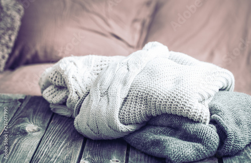 warm clothes, knitted sweaters on a wooden table