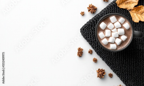 Warm Cocoa with Marshmallows in Black Mug on Cozy Knitted Mat Surrounded by Autumn Leaves and Spice Elements for Seasonal Delights