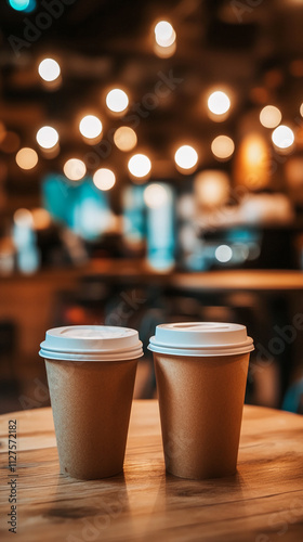 Warm coffee cups on a wooden table in a cozy cafe with soft, glowing lights in the background during late afternoon