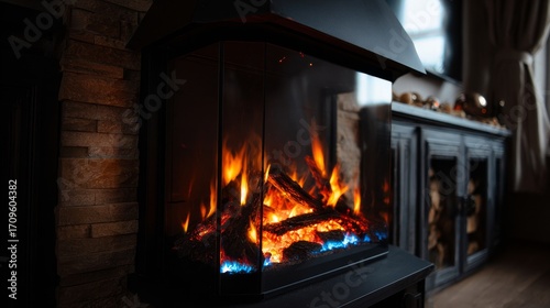 Warm cozy fire burning in modern electric wood fireplace inside living room interior, glowing flame creating relaxing home atmosphere with comfort and warmth