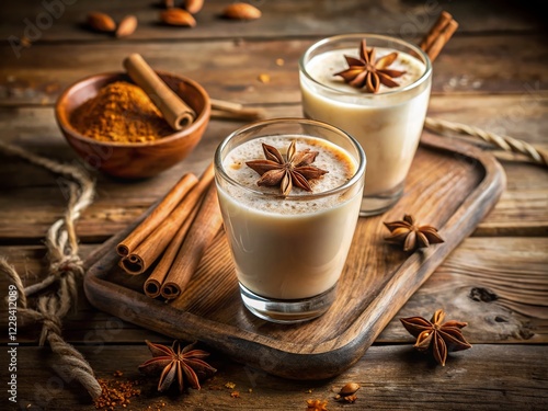 Warm Creamy Horchata with Cinnamon & Star Anise - Rustic Wooden Table Stock Photo