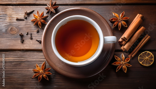 Warm Cup Of Tea With Star Anise And Cinnamon Sticks On A Rustic Wooden Tabletop