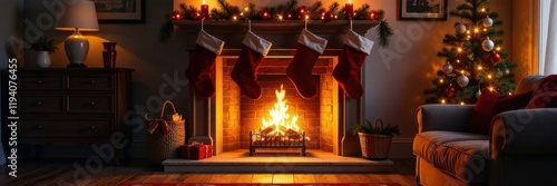 Warm glow from fireplace casting shadows on mantel with stockings, Christmas, warm glow