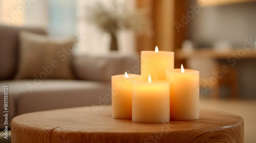 Warm glowing candles arranged on a wooden table creating a cozy and inviting atmosphere in a softly lit modern living room setting