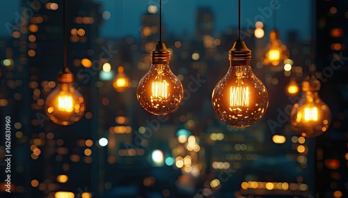 Warm, glowing Edison bulbs hang against a blurred cityscape at night