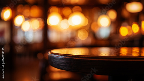 table, wood, polished, dark, texture, warm, glow, light, bokeh, blurred, background, interior, eatery, bar, evening, atmosphere, cosy, inviting, amber, orange, brown, soft, sharpened, shallow, depth