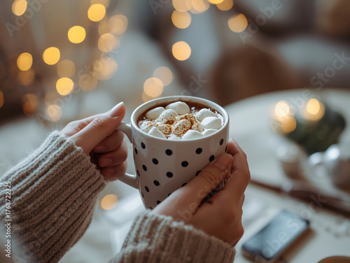 Warm hands holding hot chocolate with marshmallows in a cozy winter setting.