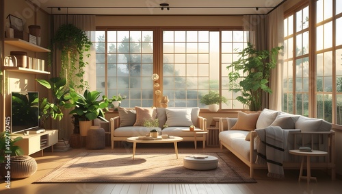Warm Japan living room with minimalist wood furniture, soft textiles, and indoor plants Sunlight streams through windows in highly detailed photorealistic style