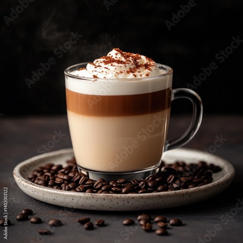 Warm, layered coffee drink with whipped cream