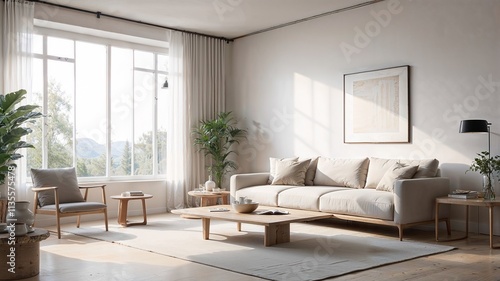Warm minimalist interior design showcasing a serene milk-white wall, a light gray sofa with clean lines, and an ecru beige rug with a soft, inviting texture for a calm and modern ambiance.