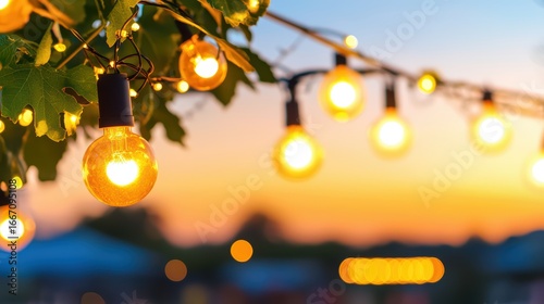 Warm String Lights Hanging Over a Sunset Scene with Blurred Background in Soft Evening Glow