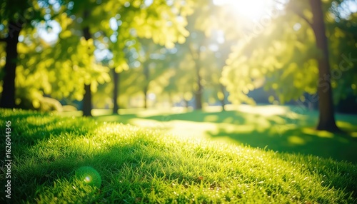 Warm sunlight filters through the trees, illuminating a lush field of vibrant green grass on a summer day